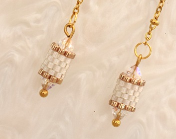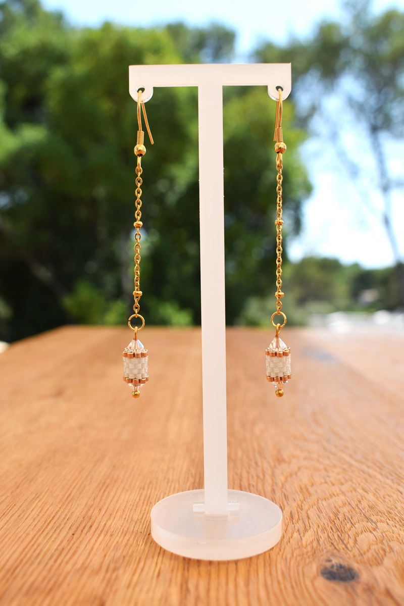 Boucles d’oreilles tissées à la main en perles de verres Miyuki et perles toupies cristal.